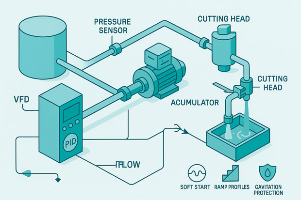 VFDs align pump output with real-time demand so water-jet cutting cells consume less energy, hold pressure steadier, and keep seals alive longer.