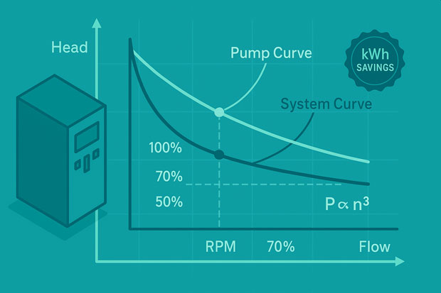 Pump affinity laws state that power varies roughly with the cube of speed, so even modest speed reductions yield significant energy savings.